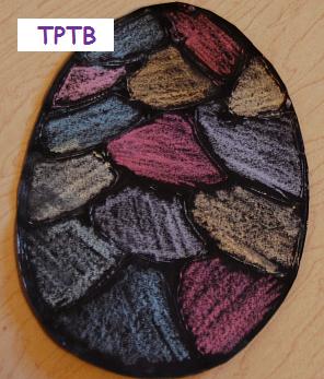 Cut a piece of black construction paper into egg shapes for each of your children. Older children can draw squiggly lines on the egg separating the egg into sections. Younger children will need assistance to do. Squeeze white liquid glue along the lines generously and allow to dry overnight. The lines will be clear when dry, but can still be seen. Color each of the sections with colored chalk.