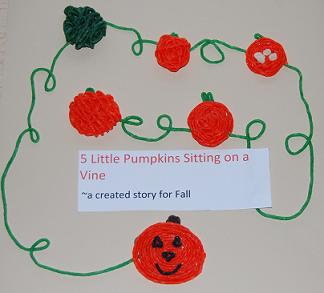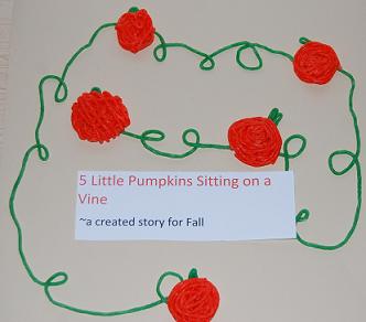 Supply each child with one large piece of construction/mounting paper to use as a storyboard (note: we covered our storyboards in clear contact paper so we could roll them for future use). Super Wikki Stix work great for making the “vines” as they are longer than regular Wikki Stix. Invite the children to use Wikki Stix to create vines on their paper. Read the chant to the children and pause as each of the 5 pumpkins are introduced. Have the children place one of the created pumpkins on the vine for each of the 5 pumpkins as the lines are read.