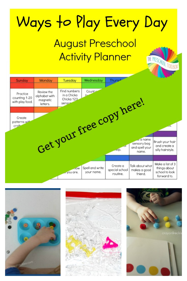 It’s already August! This month’s free printable Ways to Play Every Day Activity Calendar for preschoolers has all the activities you need as summer winds down and the school year kicks off. The first two weeks reinforce letters, numbers, shapes, and colors. The last two weeks focus on practicing self-care skills and prepping for returning to school.