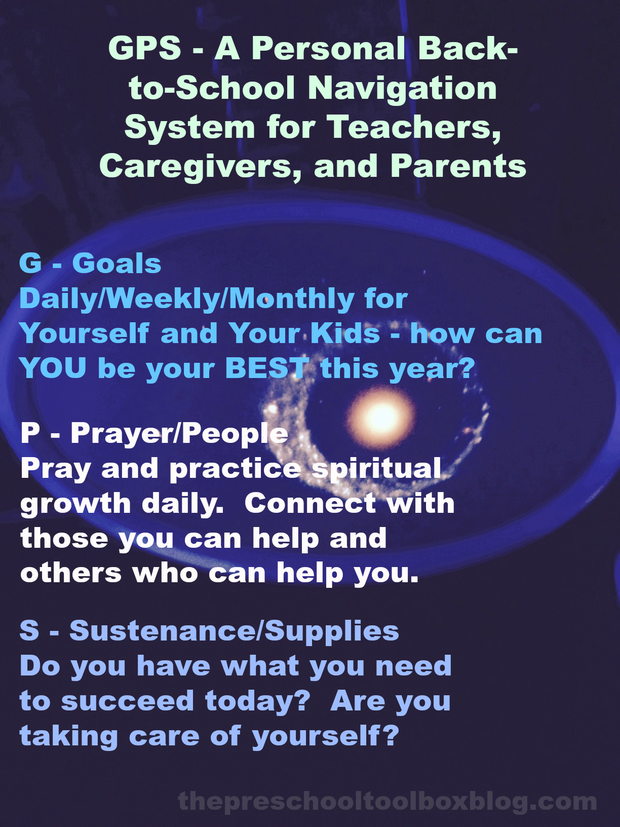 As we begin to prepare for a new school year, I love to use GPS as a guide. GPS is an intimate personal navigation system that I use daily, weekly, and monthly.