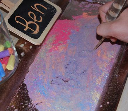I love the idea of grating chalk. We will have to try that. The chalk dust is a wonderful variation to the salt tray.