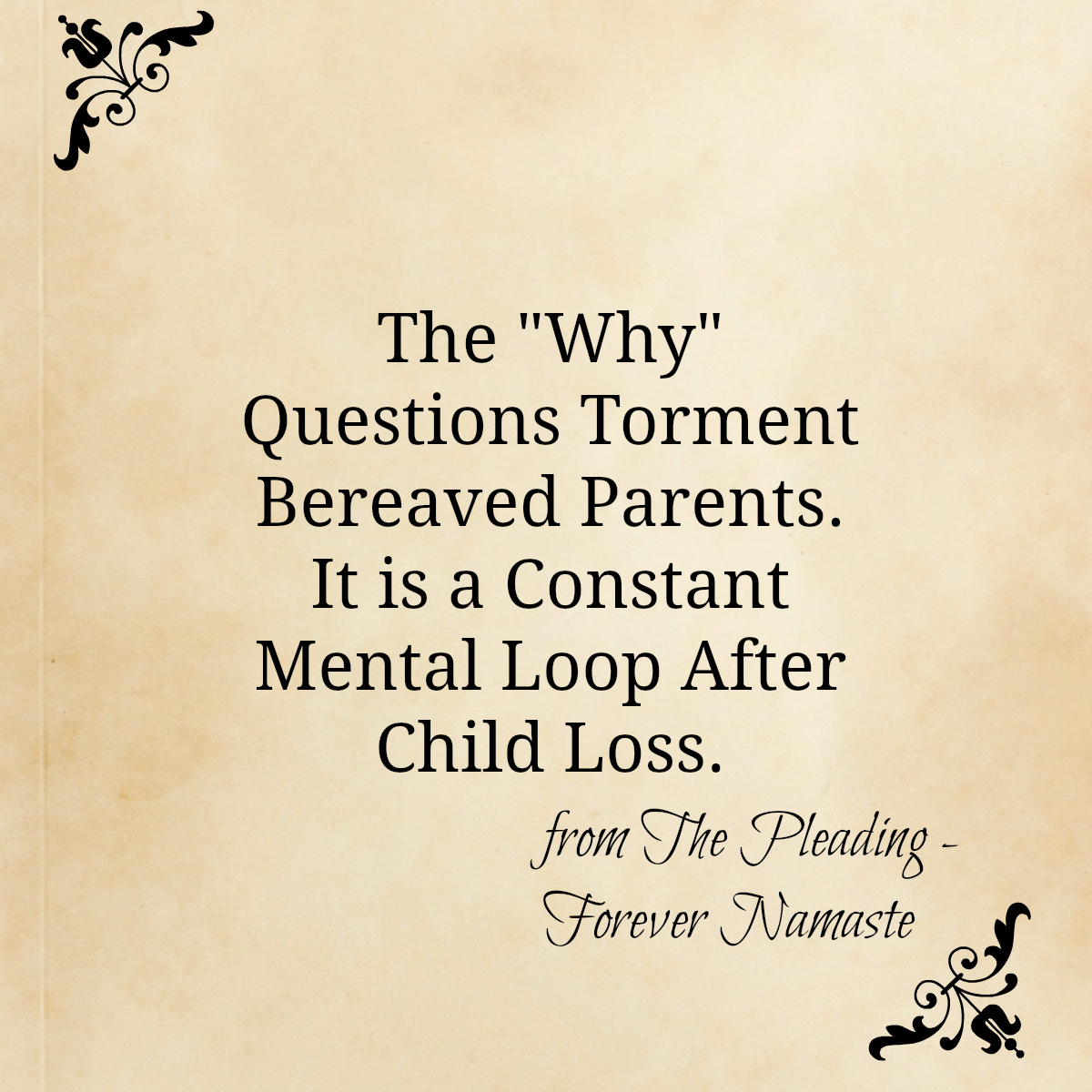 Many of my readers are aware that my daughter, Christina, died suddenly from pulmonary embolisms just after her 30th Christmas birthday. My personal journey is detailed in a raw and private account of child loss in my book, Forever Namaste: A Journey to Hope in the First Two Years after Child Loss. Early in my own journey, the WHY questions tormented and haunted me. The same questions exist for every bereaved parent who has lost a child.