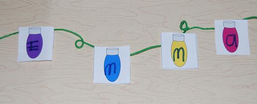 6) Print the colored bulbs or invite the children to color the blank bulbs (page 2 of the file). The children can then cut out the number of bulbs that correspond to the number of letters in their names. Have the children stamp or write each letter on the individual bulbs and then string their NAME IN LIGHTS from Wikki Stix strands.