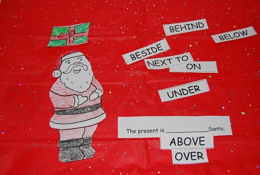 For mixed-age groups, invite the younger children to position the Santa/present. The older children must then look at the position and find the appropriate position word card to complete the sentence.