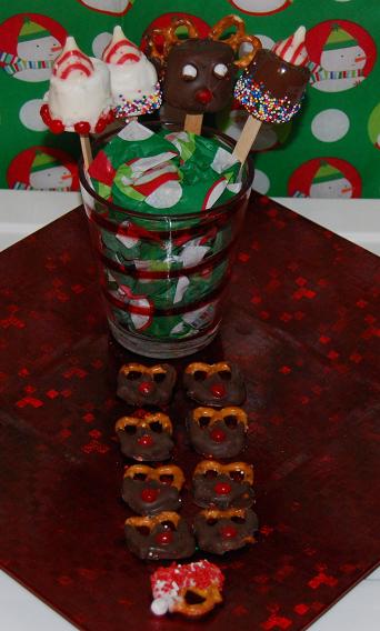 Santa hats and Reindeer: Materials needed – miniature pretzels, white and dark chocolate bark, red decorator’s sugar, white decorator’s balls, and red hots.
