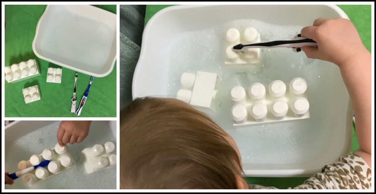 For the sensory brushing practice activity, prepare a small tub of warm, soapy water. You can add mint flavoring/extract to the water for an added sensory experience. Place white building blocks in the water for children to “brush” with toothbrushes. To step up this activity, you can paint parts of the blocks with yellow tempera paint and let dry. Children can then actually brush the “plaque” off of the “teeth”.
