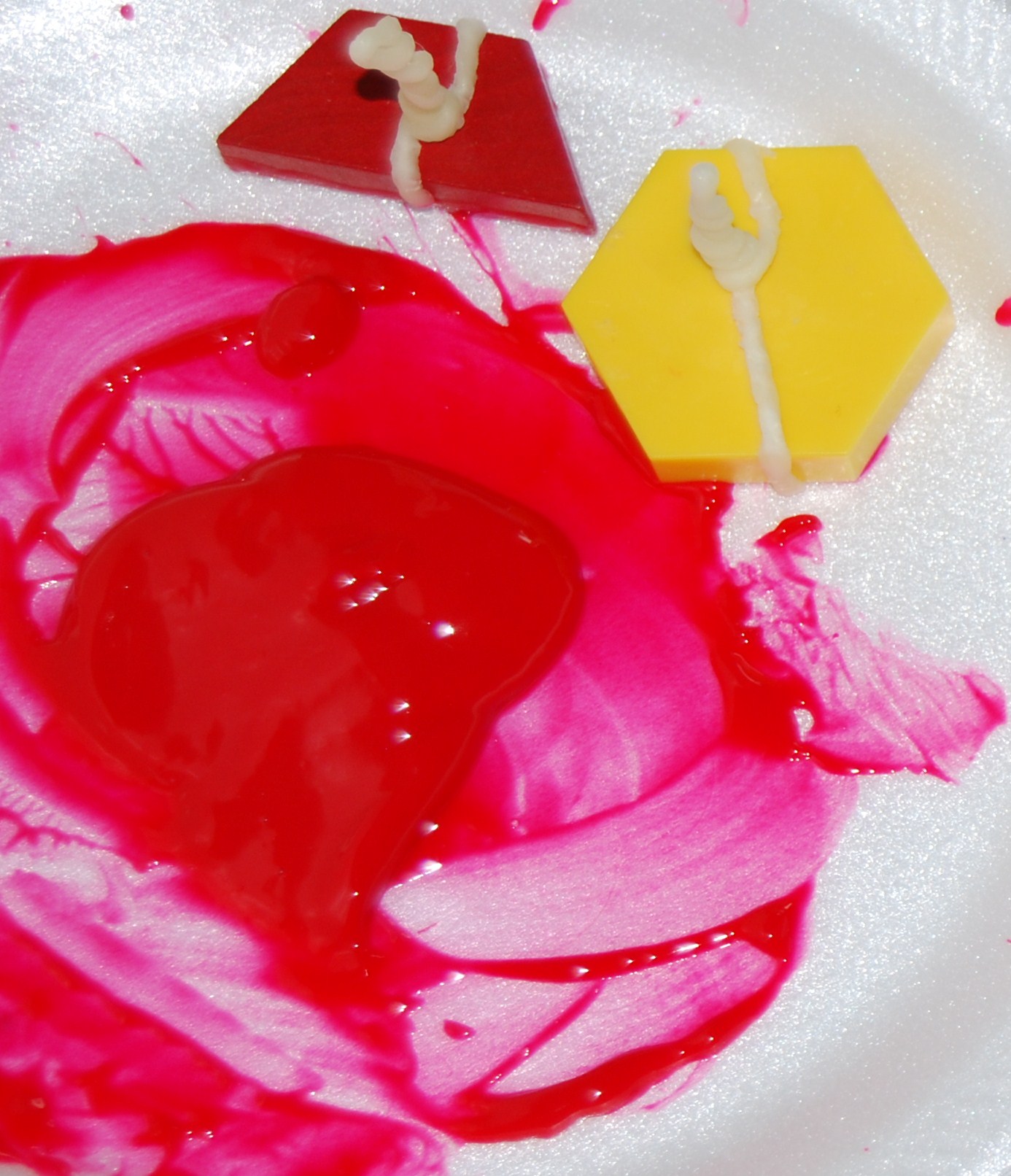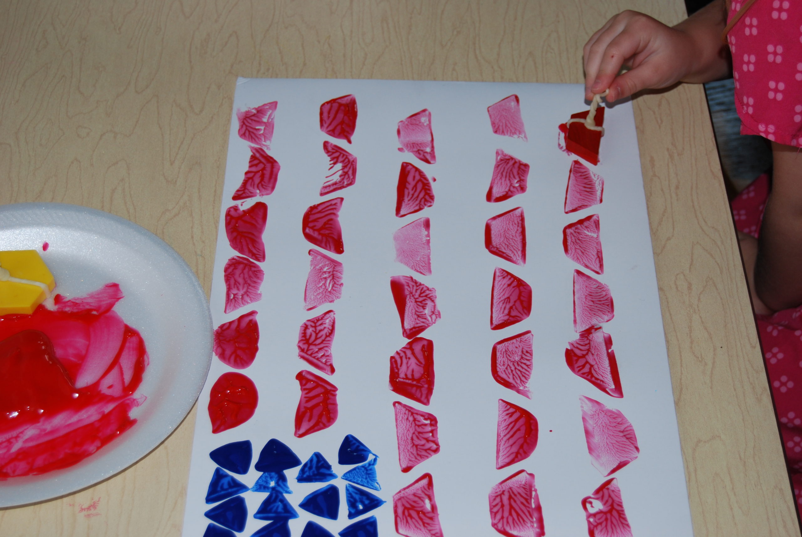Pattern Block Painted Flags 002Materials needed:  Pattern blocks, paint trays or paper plates, tempera paint (blue/red/white or other colors if outside of the U.S.), and paint smocks or an old T-shirt.