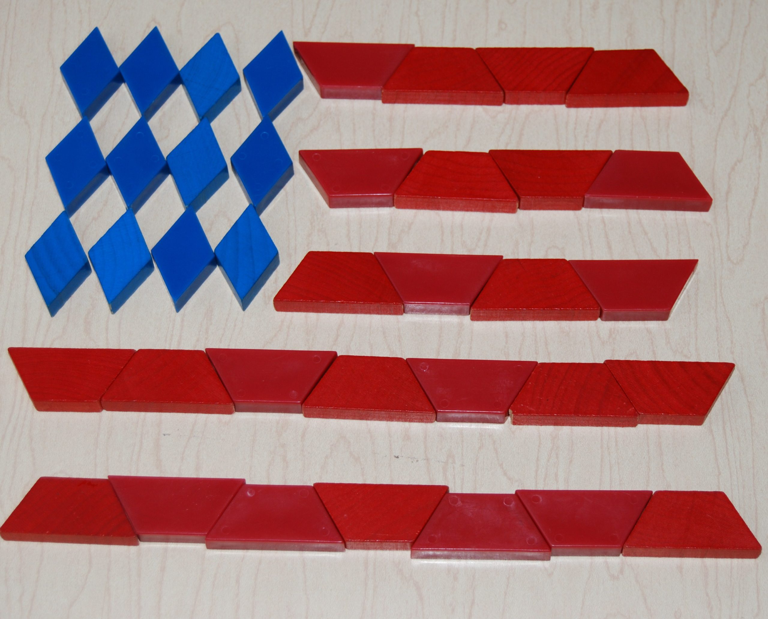 Pattern Block Painted Flags 003Invite the children to make flags by dipping the pattern blocks into the paint trays and printing on a plain sheet of paper.  We set out an American Flag so the children could copy the design when printing.  For the younger children, we penciled in the flag’s square and the stripes as visual guide for the pattern block prints.   Some of our children are not fond of messy play (it’s true)! 🙂  We improvised by using a Wikki Stix attached to only the sides of a pattern block.  The twisted end formed a  pattern block “painting tool” the kids could hold on to (see photos).