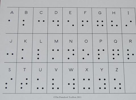 The Braille Alphabet Chart activities suggested below will offer opportunities for hands-on play with the sense of TOUCH. Through play and experimentation, the children will develop an awareness of how the sense of TOUCH is used to gain knowledge about their world.