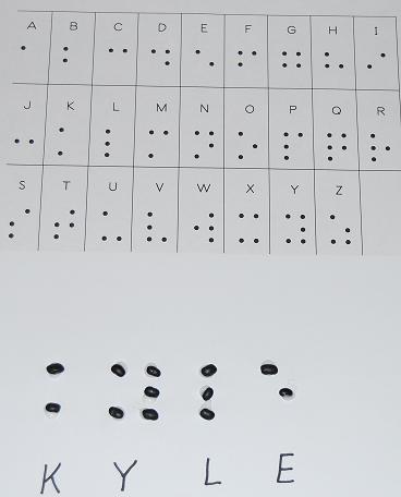 After explaining to your students why some children use Braille and their fingertips to read, each child can create their own name in Braille letters using the beans. Refer to the Braille Alphabet Chart to spell out each child’s name using the permanent marker and making the appropriate amount and position of dots. (If you use a washable marker the glue will make the color bleed on the paper). Invite each child to use a glue bottle to make small glue dots on top of the marker dots (younger children will need assistance squeezing the glue from the bottle). Note: older children may wish to make the dots with the glue bottles only. Finally, place a small dried bean on top of the glue and let dry. When dry, the child can run their fingers across the tops of the beans to see what their name would feel like in Braille writing.