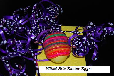 Wikki Stix©  make the perfect Easter Egg decorations for small fingers.  The Wikki Stix©   stick to the eggs without glue or other adhesives.  Have the children cut the Wikki Stix©  to the length they wish to use.  Gently press the Wikki Stix©  to the egg.  The children can create many different patterns, shapes, or faces to make their own beautiful Easter Eggs (and practice fine motor skills along the way!)
