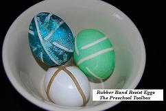 Materials needed:  hard-boiled eggs, natural egg dyes or food coloring, white vinegar, cups, spoons, and rubber bands.