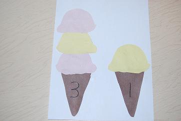 Print the template above and have the children cut out the scoops of ice cream and the cones (younger children will need assistance.) On the cones, write any number(s) that the children are working on or have the children stamp/write their own numbers. Have the children glue the appropriate number of scoops on top of the cone. Extension: Have the children use the different colored scoops to make patterns on top of each cone.