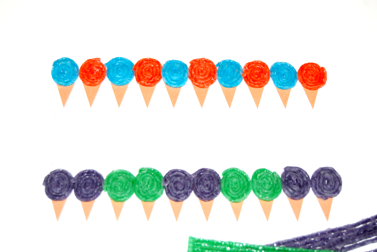 - Older kids can devise more complex patterns on their own using two or more colors of Wikki Stix to create the ice cream scoop spirals: AABB, ABBC, ABCD (four colors of Wikki Stix), and so on.