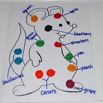Extension #2: Read “If You Give a Mouse a Cookie” by Laura Numeroff. Discuss foods and how to make healthy food choices with the children. Have the children complete the activity above “giving” their mouse fruits and vegetables with pipe cleaner, Wikki Stix spirals, or bingo dot markers. Complete the project by labeling all the colorful fruits and vegetables “given” to the mouse!