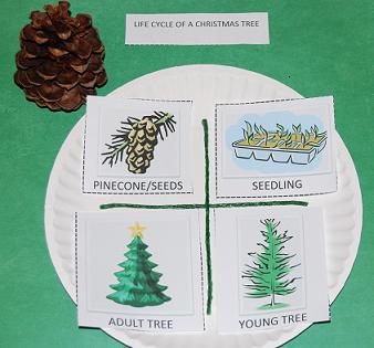 Materials needed for the paper plate craft: 1 paper plate per student/craft, 1 printable for labels/pictures/- LIFE CYCLE OF A CHRISTMAS TREE, scissors, crayons or markers, and glue sticks.