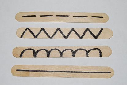 Prior to the activity: Make various line paths with a permanent marker on large wooden craft sticks or index cards. Note: the line paths in the photo above are suggestions, but any line paths can be used.