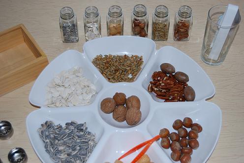 To make the Sound Shakers: for additional fine motor practice, set out various transfer tools that the children can use to move the seeds/nuts from a tray into the various sound containers (ex: spoon/melon scoop/tweezers/chop sticks/small tongs). Each container should only be filled half-way with nuts or seeds.