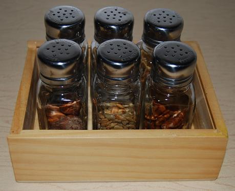 Materials needed: assorted seeds or nuts, any container (we used glass salt/pepper shakers, but cardboard tubes sealed with waxed paper and a rubber bank will work great, too).