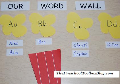 There are MANY different ways to make and use word walls for kids! At the beginning of the year, using names will help your children identify their own name and the names of classmates.