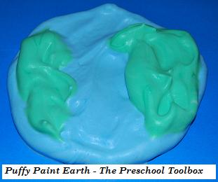 Stir the mixtures well. Have the children use the spoons to transfer the blue puffy paint (to resemble the Earth’s water) to their paper plates and spread into a circle. The children can then add the green puffy paint on top of the blue to make the Earth’s land.
