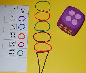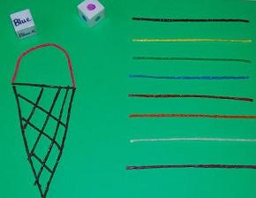 Label one blank die or foam cube with any color words your children have been working on. Have the children create the bottom of the cone on their background papers. Set out Wikki Stix colors that correspond to the colors on the labeled die. As the children roll the die, they must choose the Wikki Stix of the corresponding color to make their scoops. This game is over when all 6 colors on the labeled die are rolled. For younger children, make dots on blank die with different colors of permanent markers. The children must make the scoop that corresponds with the color of dot they roll.