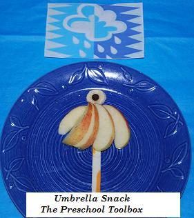 Set out apple slices, banana slices, chocolate chips, miniature marshmallows, and cheese sticks for the children. Post a picture of an umbrella and have the children try to use the snack materials to make an umbrella. Have the children describe the TASTE of their umbrellas (are they crunchy, sweet, sour, bitter, etc.) It is a fun activity for snack time and the children will amaze you with their creations!