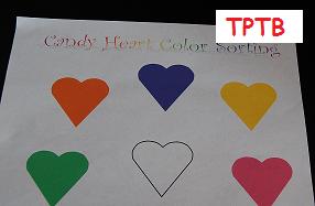 Materials needed: Candy conversation hearts, candy heart color sorting.pdf (linked above). Give each child a candy heart color sorting work mat and have children sort the hearts onto the appropriate colored heart.