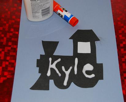 When dry, the children can use their trains as homemade rubbing plates. Place the train on a clipboard with a white sheet of paper on top. Have the children use crayons to gently rub over the train until their name appears.