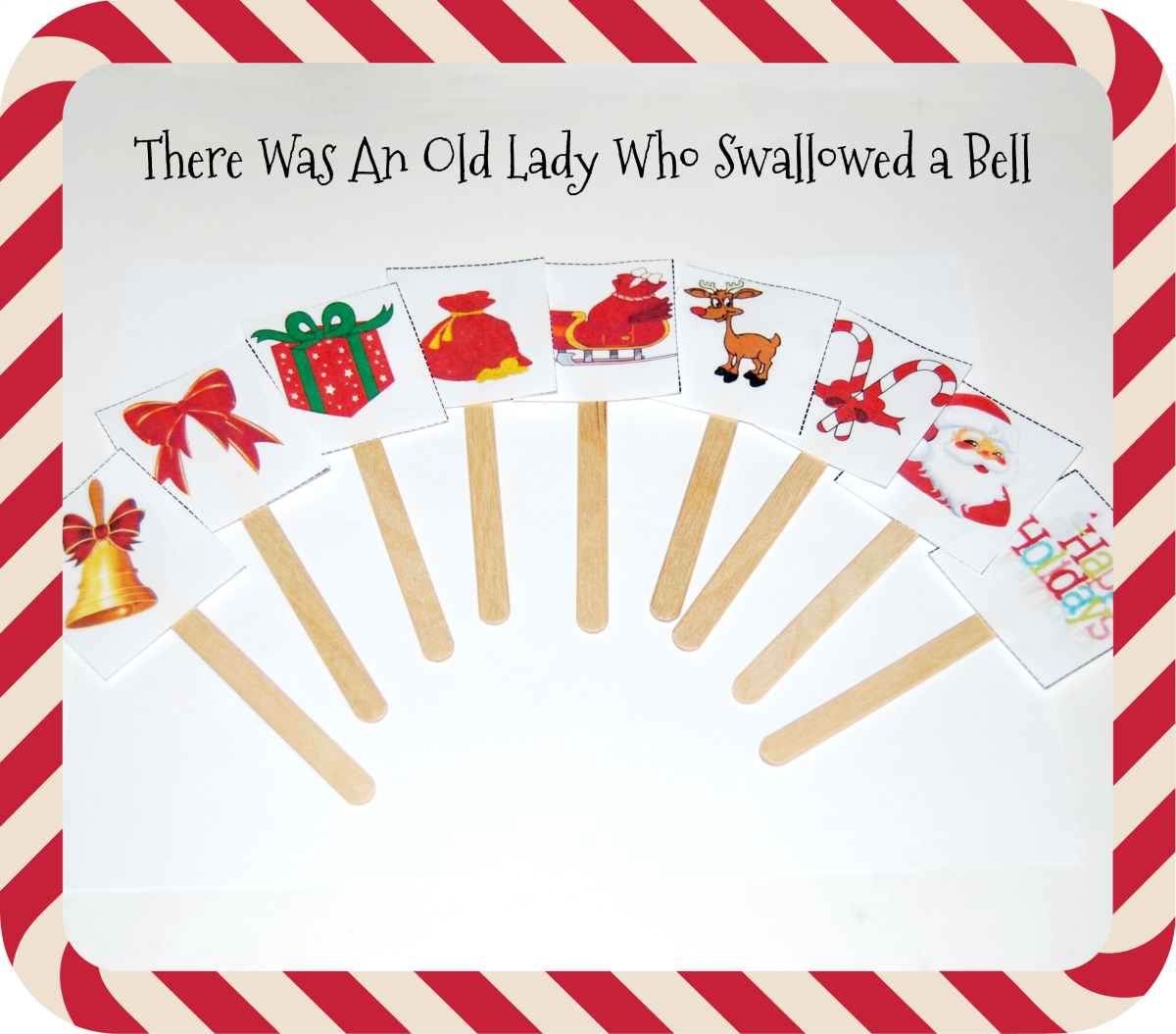 Our preschoolers loved reading and sequencing There Was An Old Lady Who Swallowed Some Leaves so much we decided to make sequencing cards and a Power Point to accompany There Was An Old Lady Who Swallowed a Bell. We’ll use in our own literacy centers for the upcoming holidays. We hope your preschoolers enjoy learning to sequence and re-tell the story while discussing the individual items as they read, play, and learn about the events in the book.