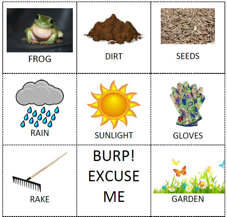 - Act out the story by asking your preschoolers to find items from the story at home or in the classroom: a plastic frog, dirt in a bag, flower seeds, water (for rain), a picture of the sun (or use the paper sun from the sequencing cards), gardening gloves, a toy rake, and real or plastic flowers (to represent the colorful garden).