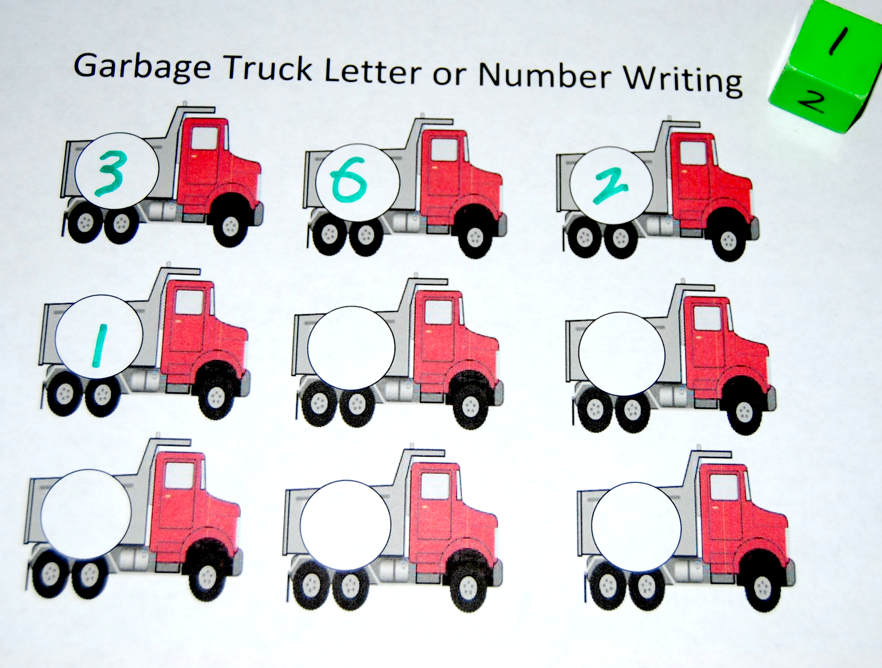 3. Preschoolers should roll the die and write/stamp the letter or number rolled onto a garbage truck (working left to right) until the printable is completed.