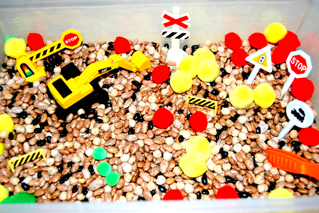 Preschoolers love to play and it may take a time or two of putting sensory bins away, but your kids will learn appropriate use of classroom materials as you discuss, play (and even put sensory bins away) over the course of a few days. Pushing, dumping, poking, re-arranging vehicles and signs, picking up beans and pom poms promotes sensory awareness through touch. Exploring the different textures, colors, and the feel of different items is a great way to play, but preschoolers build important skills along the way.