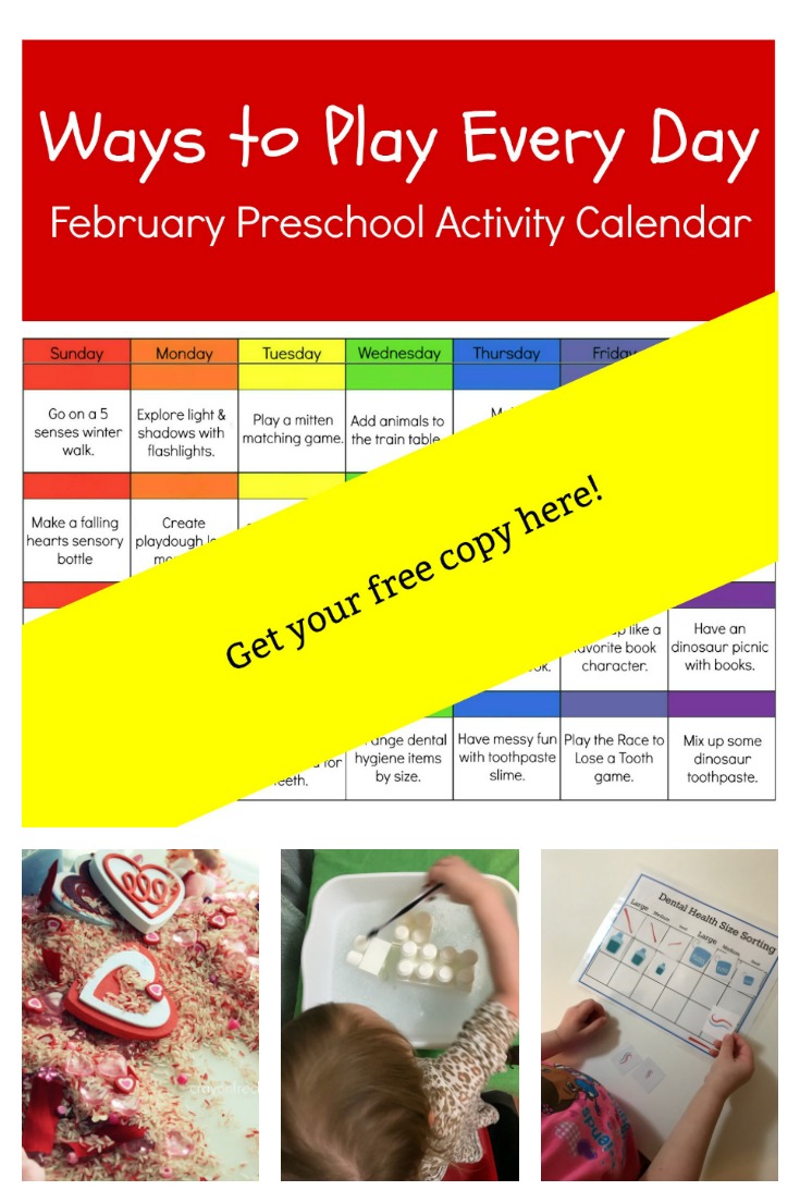 Below you’ll find descriptions of ways preschoolers can play every day in February, as well as links to corresponding activities, printables, and book lists you can use to supplement each week.