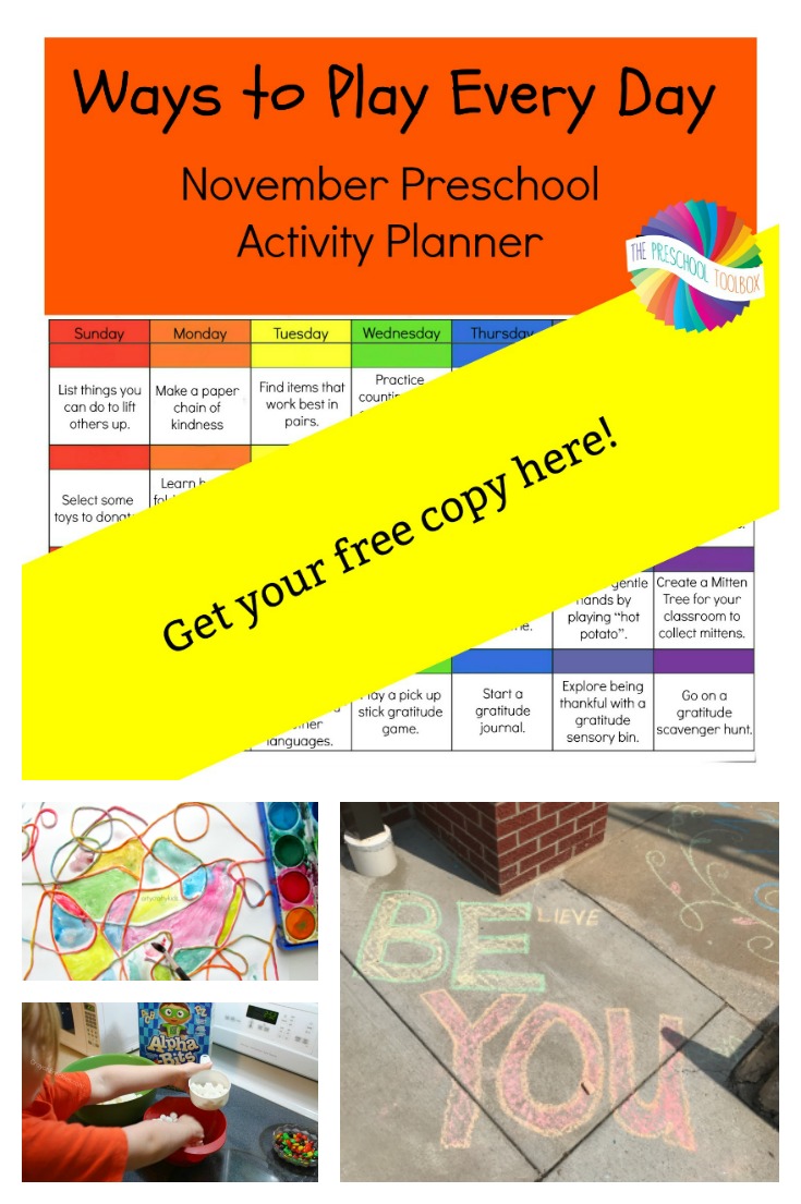 November seems to be a universal time to focus on gratitude and what we’re thankful for. Perhaps its due to the changing seasons or the atmosphere of good will with the impending holidays. This month’s FREE Ways to Play Every Day in November Activity Calendar for Preschoolers is centered around activity suggestions to help instill four important key traits in young children: I am kind; I am helpful, I am giving; and I am thankful. The activities present opportunities to practice academic skills, life skills, and interpersonal skills all month long in the classroom, in childcare, or at home.
