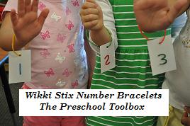 Prior to the doing the activity with the children, you will need to cut index cards into small squares and hole punch a circle at the top. Use 1 or 2 Wikki Stix© to create a loop bracelet through the hole-punched circle. Finally, use the Wikki Stix© or a marker to create or write numerals on the index cards.