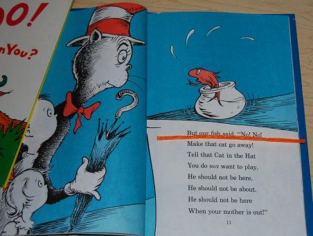 One of the most beloved Dr. Seuss books is Cat in the Hat! Using Wikki Stix as a line guide for beginning readers is helpful! The Wikki Stix will adhere to the page and can be removed without harming the book.