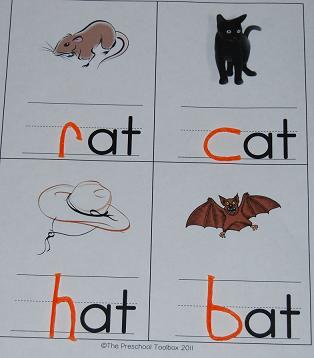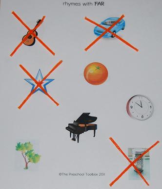 Print the file (linked above) for each of your children. Have the children use the Wikki Stix to make an X over each of the rhyming pictures on the pages (see photo above.)