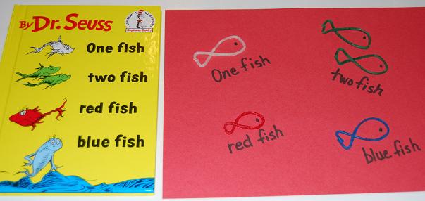 After reading One fish Two fish Red fish Blue fish by Dr. Seuss, give the children one White Wikki Stix, two Green Wikki Stix, one Red Wikki Stix, and one Blue Wikki Stix.